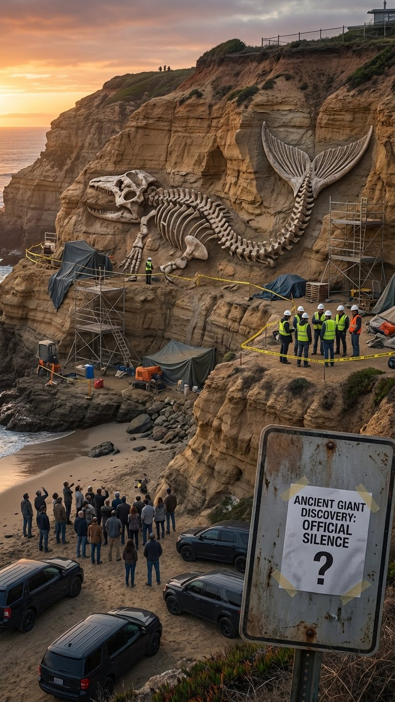 Archaeologists and geologists have just announced a shocking discovery: a giant skeleton, tens of meters long, unexpectedly revealed on a coastal cliff — what many experts are calling the most spectacular evidence of a prehistoric creature ever recorded. The strange thing is that the skeleton is unlike any paleontological species in the existing fossil record: it has a long body like a sea dragon, a fan-like tail like a mythical creature, and a bone structure that suggests it was once an ancient ocean ruler.
