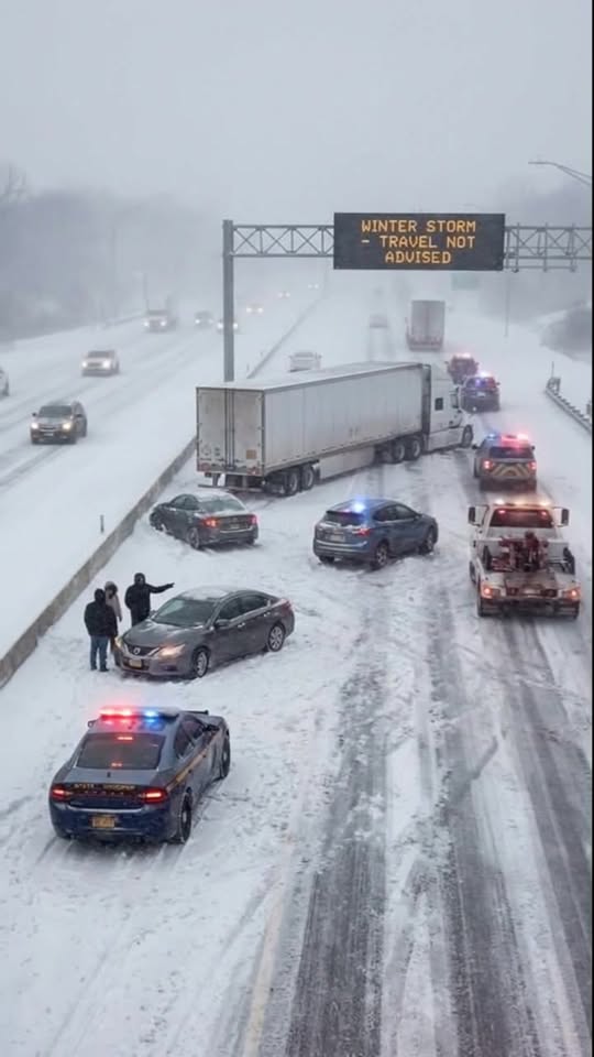 Overall, the image reflects the reality that nature can exert enormous power, reducing human mobility and control regardless of preparation or technology. It tells a story of a highway that is normally bustling with traffic but is now paralyzed by a winter storm; of vehicles rendered helpless by icy conditions; and of dedicated rescue crews working tirelessly in extreme weather to protect others. This is not merely a scene of blocked traffic—it is a moment that captures the essence of a North American winter: cold, fierce, and filled with lurking danger.