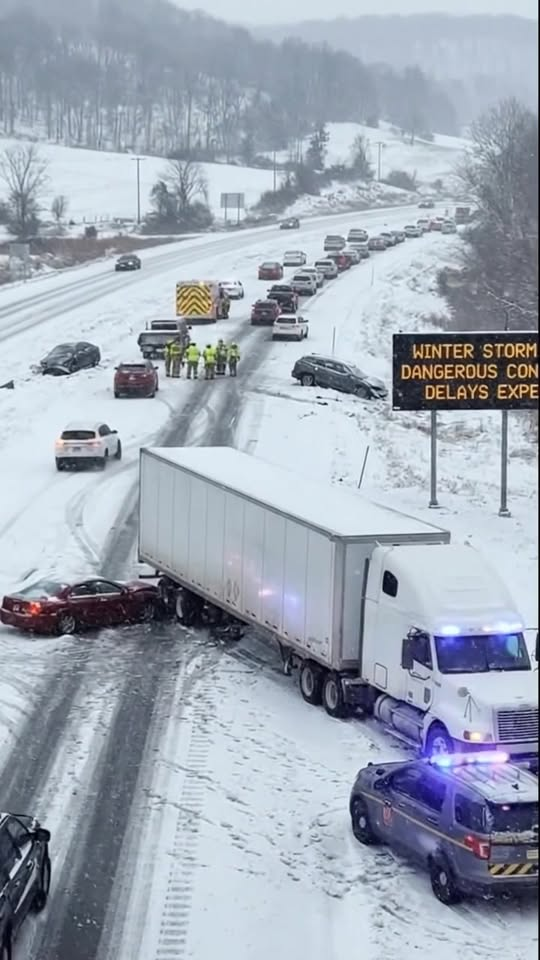 When the storm eventually pᴀsses, the snow will stop falling. The fog will lift. Tow trucks will arrive, damaged vehicles will be removed, and the long line of stranded drivers will gradually merge back into a flowing stream of traffic. The highway will regain its rhythm. But the memory of this moment—the frozen stillness, the jackknifed truck, the swirling snow, the glowing warning sign—will linger.