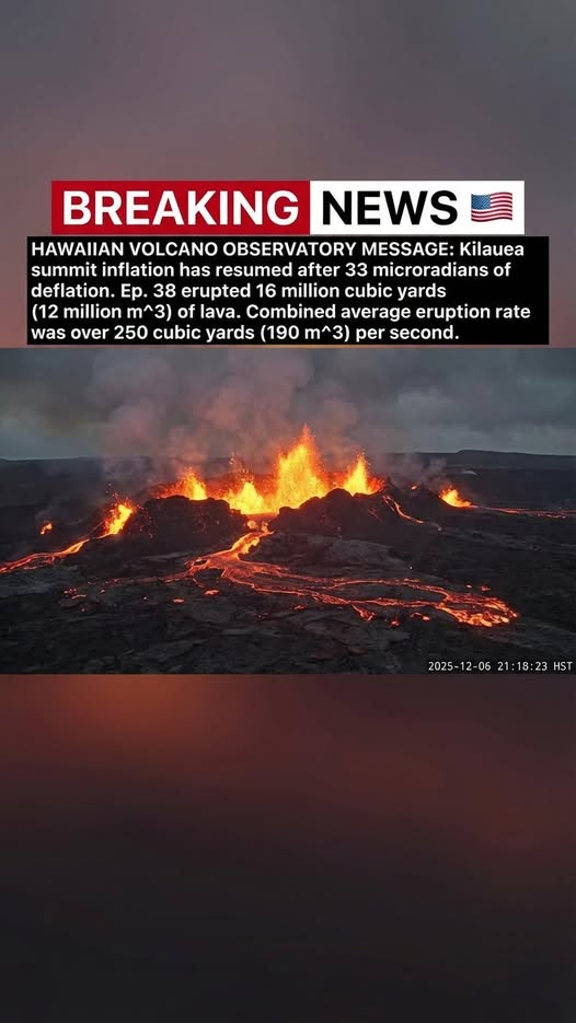 In my two decades of reporting on natural disasters—from hurricanes tearing across coastlines to earthquakes shaking cities without warning—few phenomena command the same immediate respect and primal awe as a volcanic eruption. The image before us captures exactly that: Kīlauea, one of the most active and closely monitored volcanoes on Earth, roaring back to life in an unmistakable display of raw geological power. The accompanying Breaking News bulletin from the Hawaiian Volcano Observatory sets the tone immediately, confirming what volcanologists have been watching with increasing concern: inflation has resumed at the summit after a period of deflation, and the volcano has produced staggering volumes of molten rock at astonishing speed.