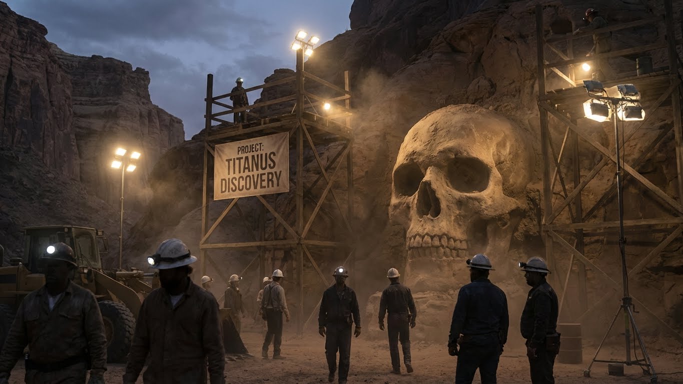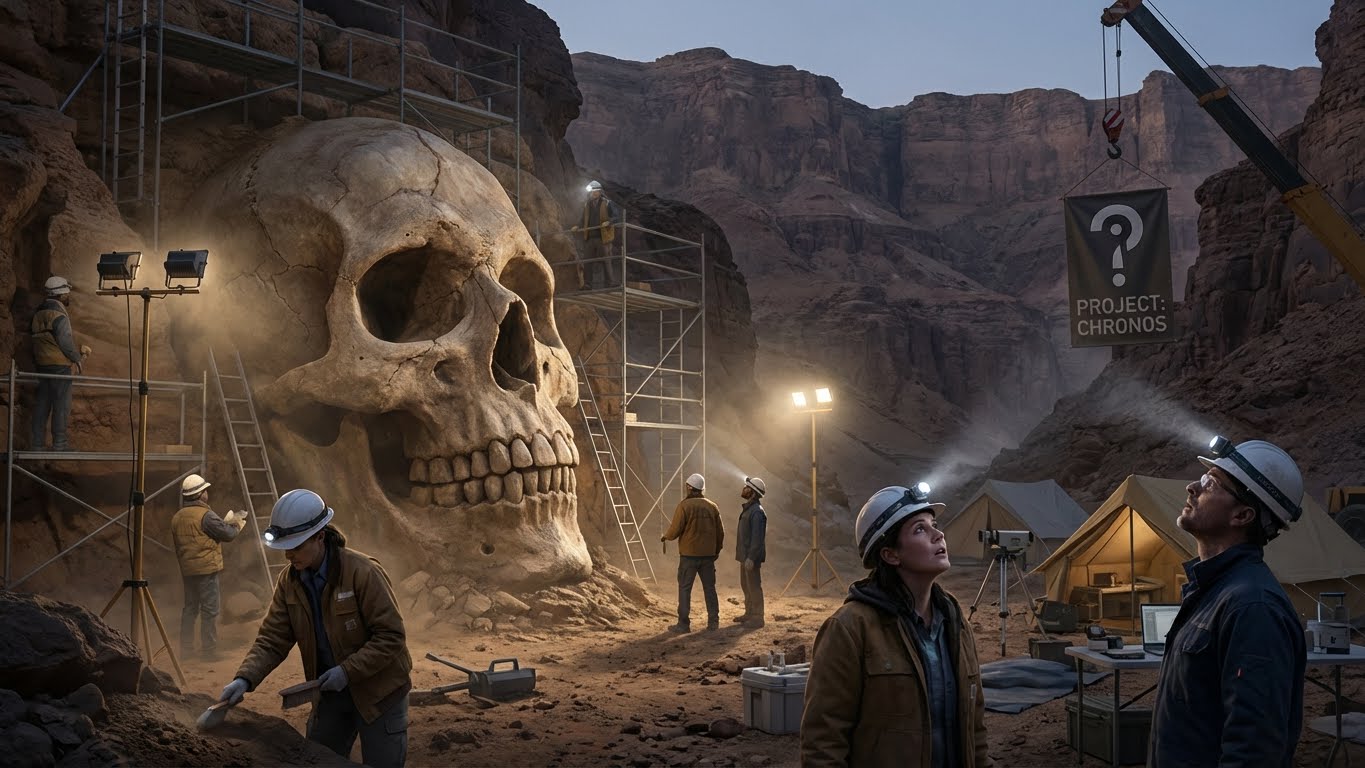 From an archaeological perspective, the image presents a dramatic excavation scene centered on a colossal human-like skull embedded within a stratified rock formation, illuminated by floodlights and surrounded by workers, scaffolding, and media equipment. At first glance, the setting resembles a controlled archaeological dig, possibly situated in an arid canyon landscape evocative of North America, the Near East, or Central Asia. The banner reading “Giant Discovery? Forbidden Archaeology?” frames the scene as controversial, implying suppression or secrecy. However, no verified archaeological record supports the discovery of human skeletal remains of this scale in any period of human evolution. If interpreted literally, such a skull would exceed all known hominin morphology and contradict established principles of biology, paleoanthropology, and biomechanics.
