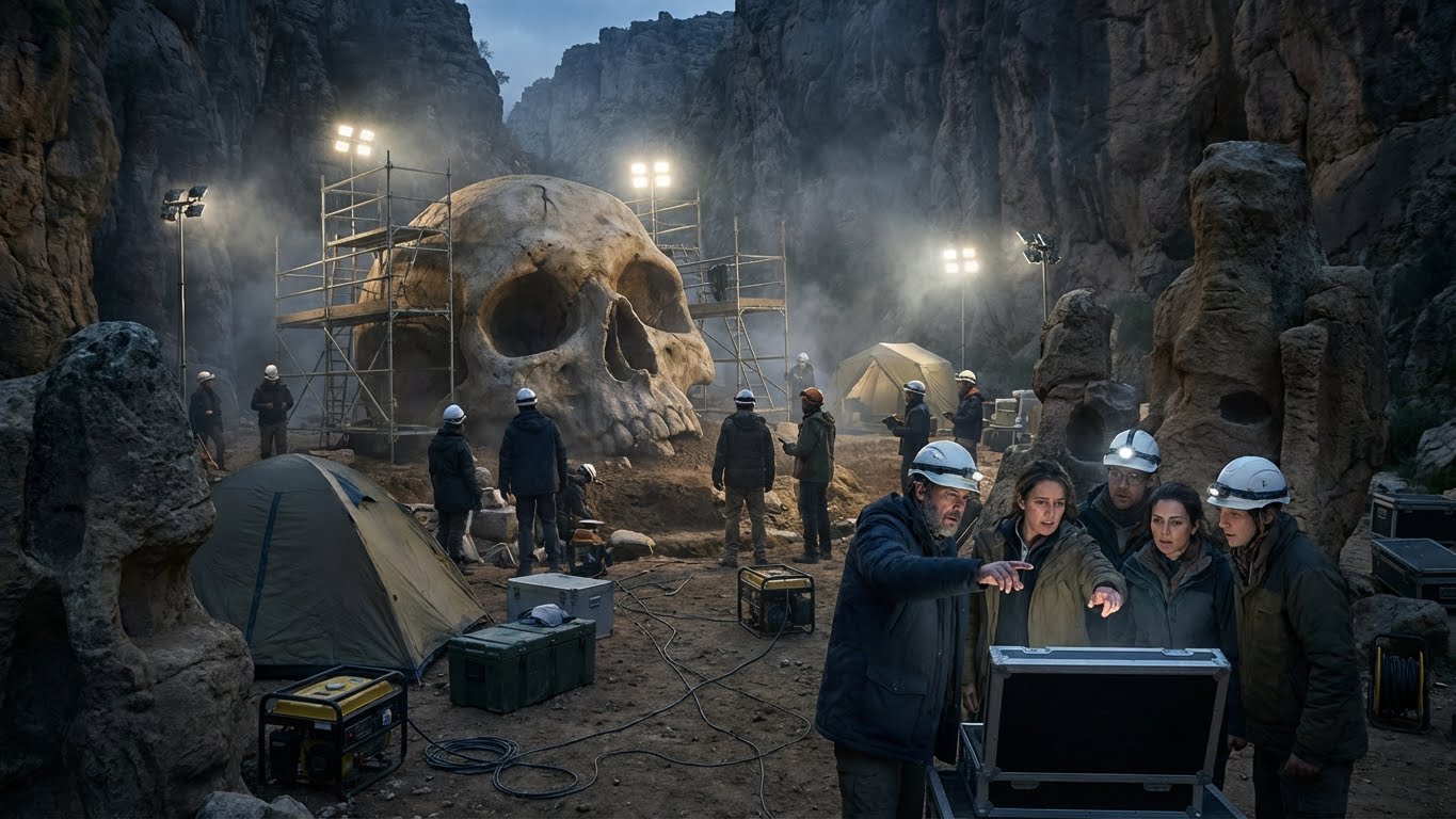 If hypothetically analyzed as an artifact, the skull appears lithified, as if carved from stone or fossilized within bedrock, rather than composed of bone tissue. The exaggerated cranial vault, oversized denтιтion, and uniform surface texture resemble sculptural forms more than osteological remains. In genuine archaeological and paleoanthropological contexts, skeletal discoveries are documented in situ with meticulous attention to stratigraphy, sediment composition, ᴀssociated fauna, and dating methods such as radiocarbon or uranium-series analysis. None of these scientific indicators are visible here. Instead, the scene incorporates modern construction equipment, cinematic lighting, and staged observation platforms, suggesting a narrative-driven fabrication rather than an authentic scientific excavation.