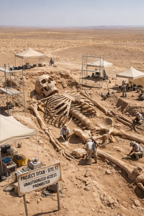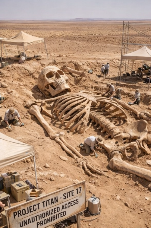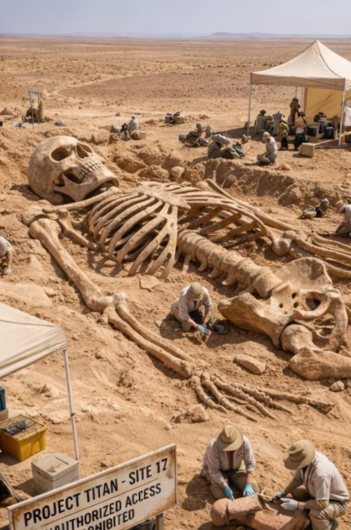 The burial known as “Site 17 – Project тιтan” was discovered in a remote arid basin located at the margin of a desert plateau, characterized by sparse vegetation and deep sedimentary deposits. The find was made during a large-scale survey aimed at documenting prehistoric occupation zones threatened by erosion. Excavation revealed an enormous humanoid skeleton lying supine within a shallow pit carved directly into compacted desert sediment. Preliminary stratigraphic analysis, combined with optically stimulated luminescence (OSL) dating of surrounding sediments, suggests a chronological range between 12,000 and 9,000 BCE, corresponding to the terminal Pleistocene or early Holocene. The burial context appears deliberate and formal, indicating intentional interment rather than a natural accumulation of remains.