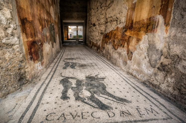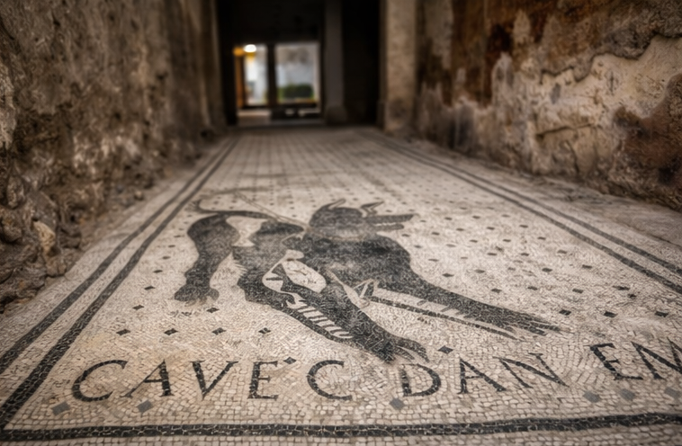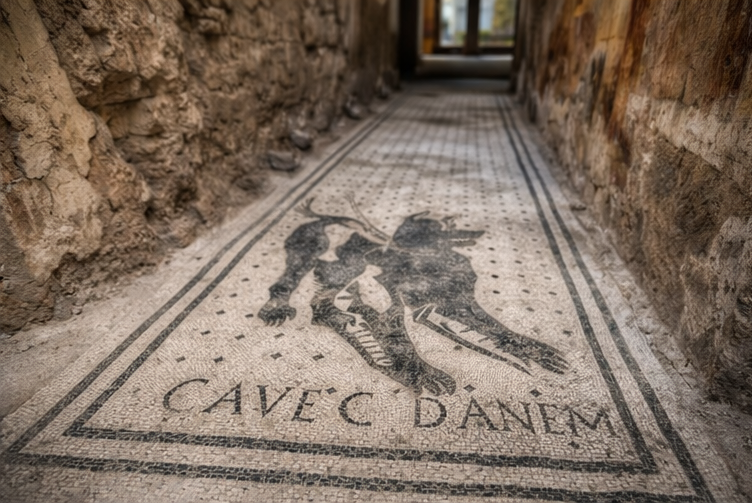 The House of the Tragic Poet was excavated in 1824 under the Bourbon-led excavations of Pompeii, later continued by Italian archaeological authorities. Since then, the Cave Canem mosaic has become one of the most iconic images of Roman archaeology. Its significance lies not in monumentality, but in intimacy—it reveals how ordinary Romans perceived danger, property, and domestic order. Archaeologically, the mosaic offers invaluable insight into literacy, symbolism, and daily life in the Roman world, bridging the gap between grand imperial history and lived human experience.