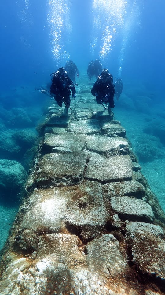 What we see here is a long, linear stone structure composed of fitted blocks, extending forward into the blue haze of the Mediterranean seabed. The stones are not randomly deposited. Their alignment is deliberate, their surfaces flattened by human hands, and their spacing suggests planning rather than chance. This is not the chaos of a shipwreck or the scatter of natural rockfall—it is architecture.